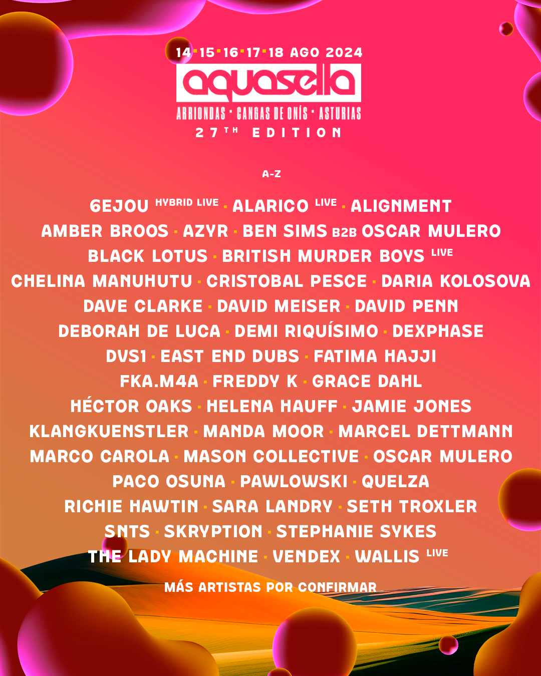 Esta avance para Aquasella 2024 también propone otros nombres que no han pasado aún por el festival, destacando al productor de house más internacional de nuestro circuito, David Penn. También debut de diferentes propuestas del techno como el del productor francés de Quelza o el formato directo del italiano Alarico live, nombre artístico de Alarico Zucchi.