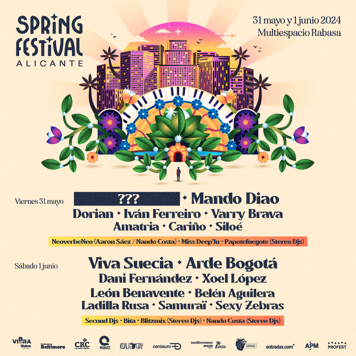 Durante los días 31 de mayo y 1 de junio, el Multiespacio Rabasa volverá a abrir sus puertas para acoger dos jornadas que se convertirán en la cita musical más esperada de la primavera alicantina. A pesar de que todavía queda una gran sorpresa por desvelar que también actuará en la primera jornada, también conocemos que el viernes 31de mayo, se darán cita sobre los escenarios del Spring Festival Mando Diao, Dorian, Iván Ferreiro, Varry Brava, Amatria, Cariño y Siloé que dejarán boquiabiertos a todos los asistentes. La jornada no terminará sin contar con los djs que harán disfrutar de los sets más bailongos como por ejemplo Neoverbeneo (Aaron Saéz y Nando Costa), Miss Deep ‘In y Papotefuegote (Stereo Djs).