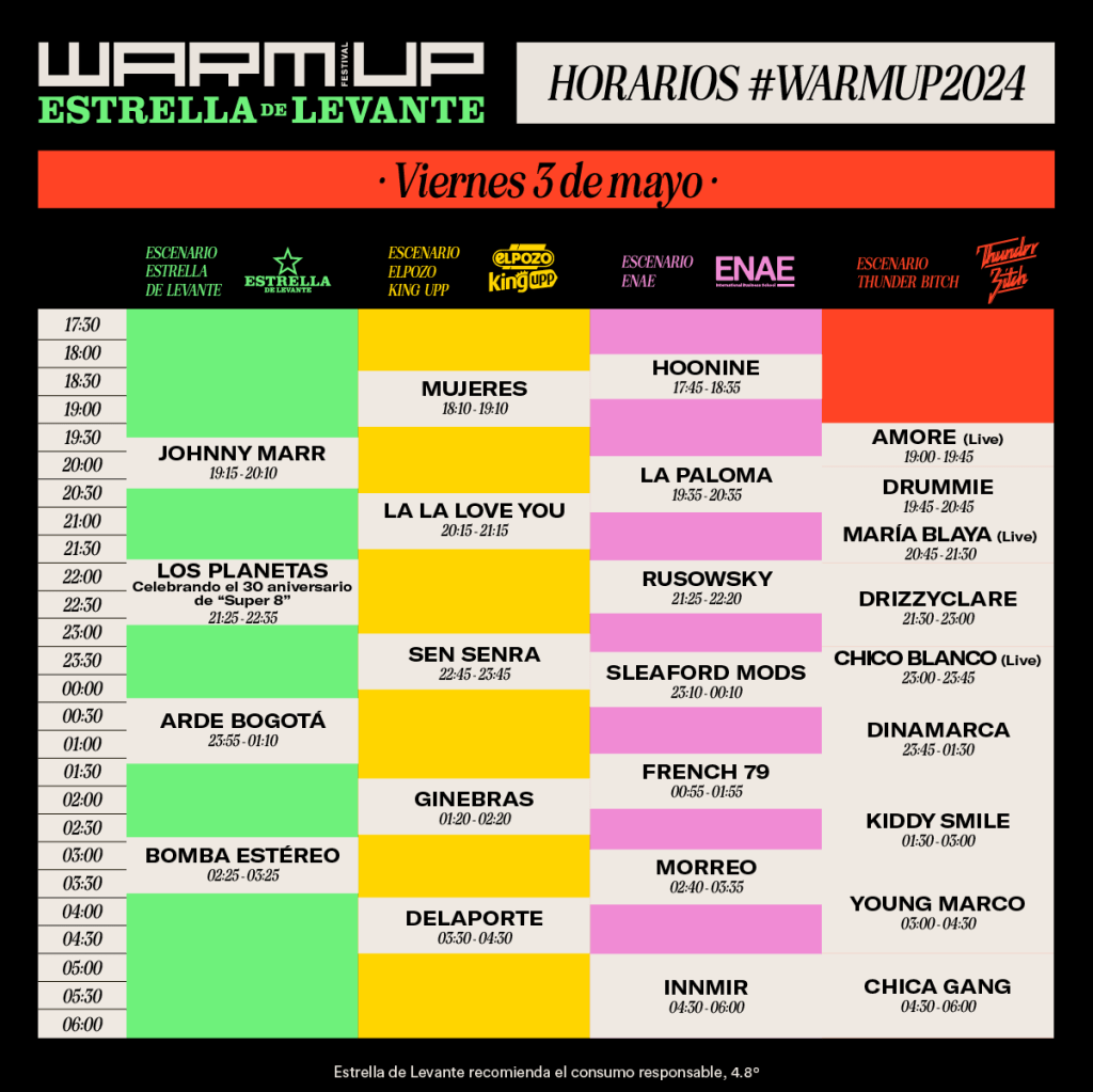 Un line-up de altura que convertirá de nuevo a #WARMUP2024 en uno de los primeros grandes festivales de la temporada, contando también con un concierto muy especial de los locales Viva Suecia —en el que celebrarán su décimo aniversario como banda—, Arde Bogotá, Sidonie o Johnny Marr, que pisarán el Escenario Estrella de Levante, o los siempre divertidos La La Love You, Shinova, Ladilla Rusa, Veintiuno o Delaporte que pasarán por elEscenario ElPozo King Upp.
