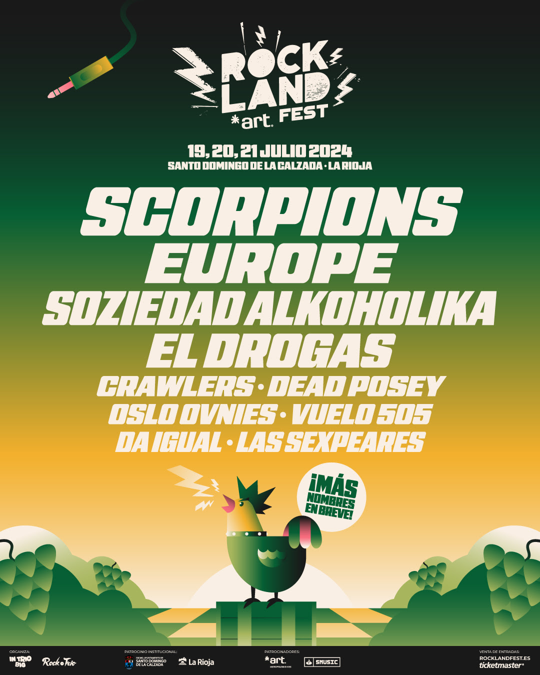 RockLand Art Fest anuncia el cartel para su próxima edición, que tendrá lugar del 19 al 21 de julio de 2024 en Santo Domingo de la Calzada, La Rioja. Un line-up formado por SCORPIONS, EUROPE, SOZIEDAD ALKOHOLIKA, EL DROGAS (BARRICADA 40º), DEAD POSEY, CRAWLERS, OSLO OVNIES, VUELO 505, DA IGUAL, LAS SEXPEARES a los que se le sumarán nuevos nombres que se anunciarán próximamente.