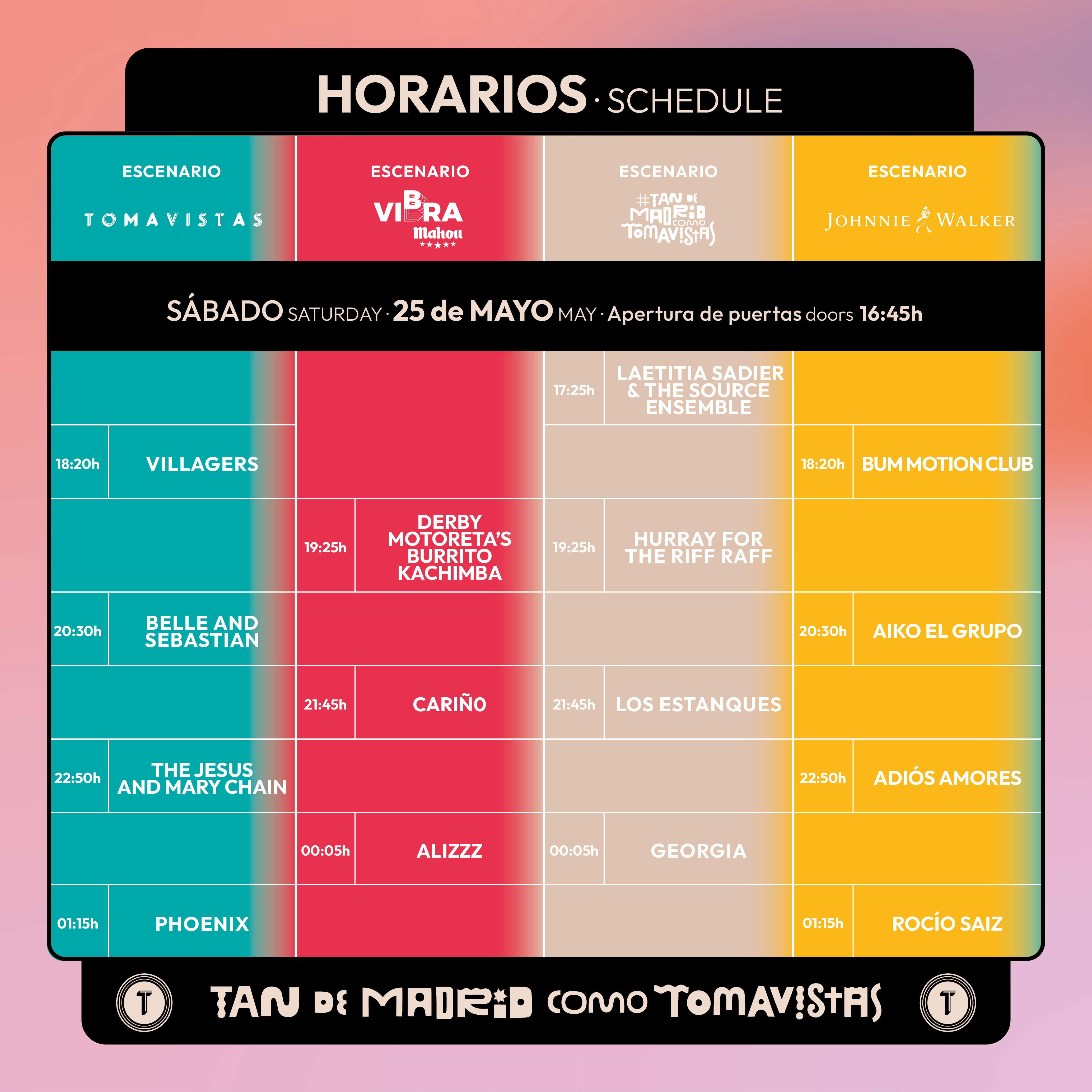 El escenario Johnnie Walker abrirá con Bum Motion Club, seguidos de Aiko El Grupo y Adiós Amores, que dejarán paso al broche final con el directo de Rocío Saiz. Por el escenario Vibra Mahou pasarán los Derby Motoreta’s Burrito Kachimba, Cariño y Alizzz, este último con la presentación oficial en Madrid de su nuevo disco recién publicado.