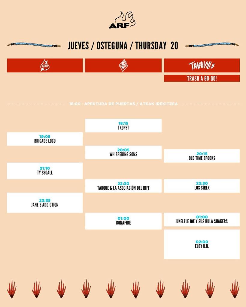 Azkena Rock Festival arranca el jueves con una de las bandas de culto más influyentes, Jane’s Addiction. Les siguen el ecléctico Ty Segall, músico inquieto y sin miedo a fusionar géneros, y la sólida banda de Carlos Tarque, el vocalista más reputado del rock en español, Tarque & La Asociación del Riff. El hard rock de Bonafide, liderada por el guitar hero sueco Pontus Snibb. La revelación post punk belga de Whispering Sons, y el punk y rock alternativo vasco representado por Brigade Loco y Txopet. Ya en Trashville, el escenario cubierto que recrea una sala donde lo que pasa en Trashville, se queda en Trashville, será el turno de Los Sírex, banda reverenciada y autora del himno ‘Si yo tuviera una escoba’. Junto a ellos, los ritmos frenéticos de punk rock, garage y surf de Ukelele Joe y Sus Hula Shakers y el espectáculo salido de una película de terror de serie B fusionado con instrumentos tradicionales del folk de Old Time Spooks. Cerrando la noche, el DJ Eloy R.B.