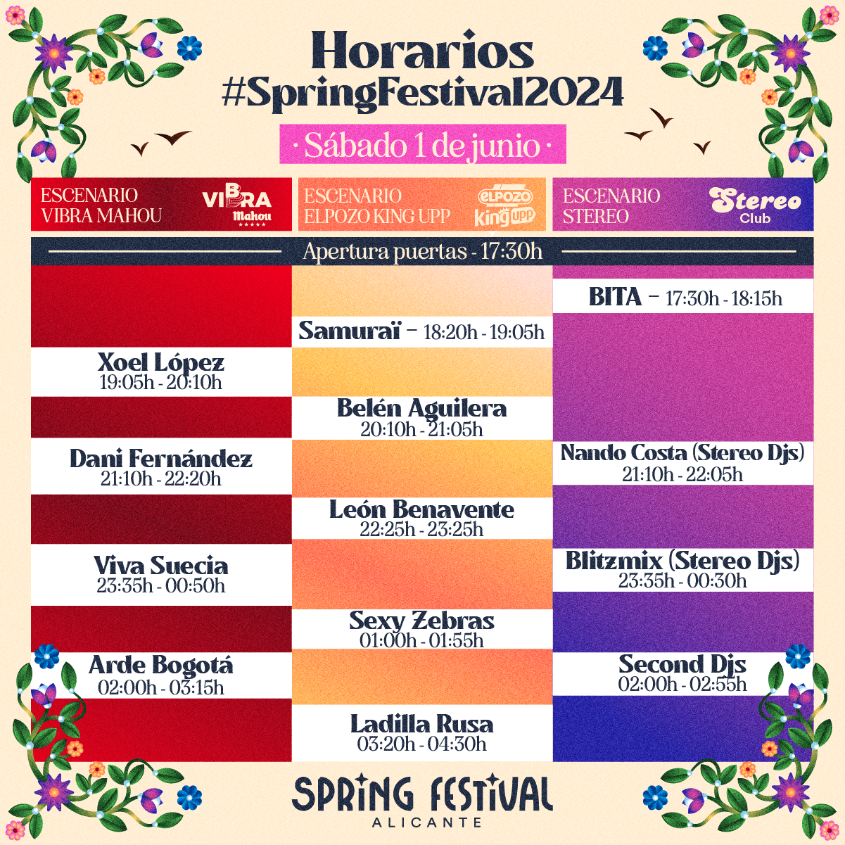 A poco más de semanas para inaugurar la segunda edición de Spring Festival en Rabasa, la organización anuncia hoy los horarios de sus tres escenarios: Escenario Vibra Mahou, Escenario ElPozo KING UPP y Escenario Stereo Club, en los que se darán cita durante los días 31 de mayo y 1 de junio artistas de la talla de Mando Diao, Vetusta Morla, Viva Suecia, Arde Bogotá, Dani Fernández o Belén Aguilera entre otros muchos. Con la publicación de los horarios de esta edición, la organización da comienzo a la recta final de la espera para la tercera edición en la ciudad de Alicante que promete ser muy especial y que, como bien se ha demostrado con el sold out de abonos y entradas de sábado a casi un mes de la celebración del festival, la gente espera con muchas ganas.