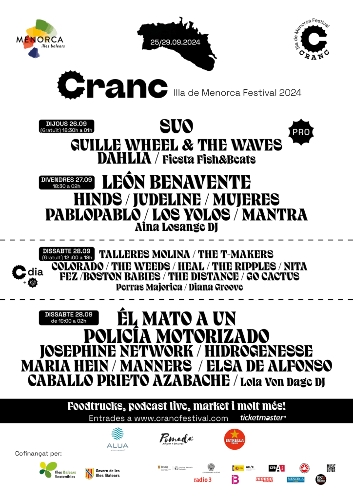 Un festival que hoy suma nuevos artistas a su ya abultado cartel. Quizás los más destacados sean ese fenómeno internacional de nuestra música que es Hinds, la madurez de unos León Benavente que celebran diez años sobre las tablas, y el jovencísimo talento de pablopablo y su facilidad pasmosa para regalarnos grandes canciones. Pero el CRANC, siempre atento también a la cantera balear, no ha dudado en invitar también en esta su octava edición a propuestas tan interesantes como Guille Wheel & The Waves, The Weeds, y , Talleres Molina, The Distance y The T-Makers. Para rubricar esta última andanada de flamantes incorporaciones, también contamos con la presencia de Lola Von Dage, toda una garantía en la cabina de dj.