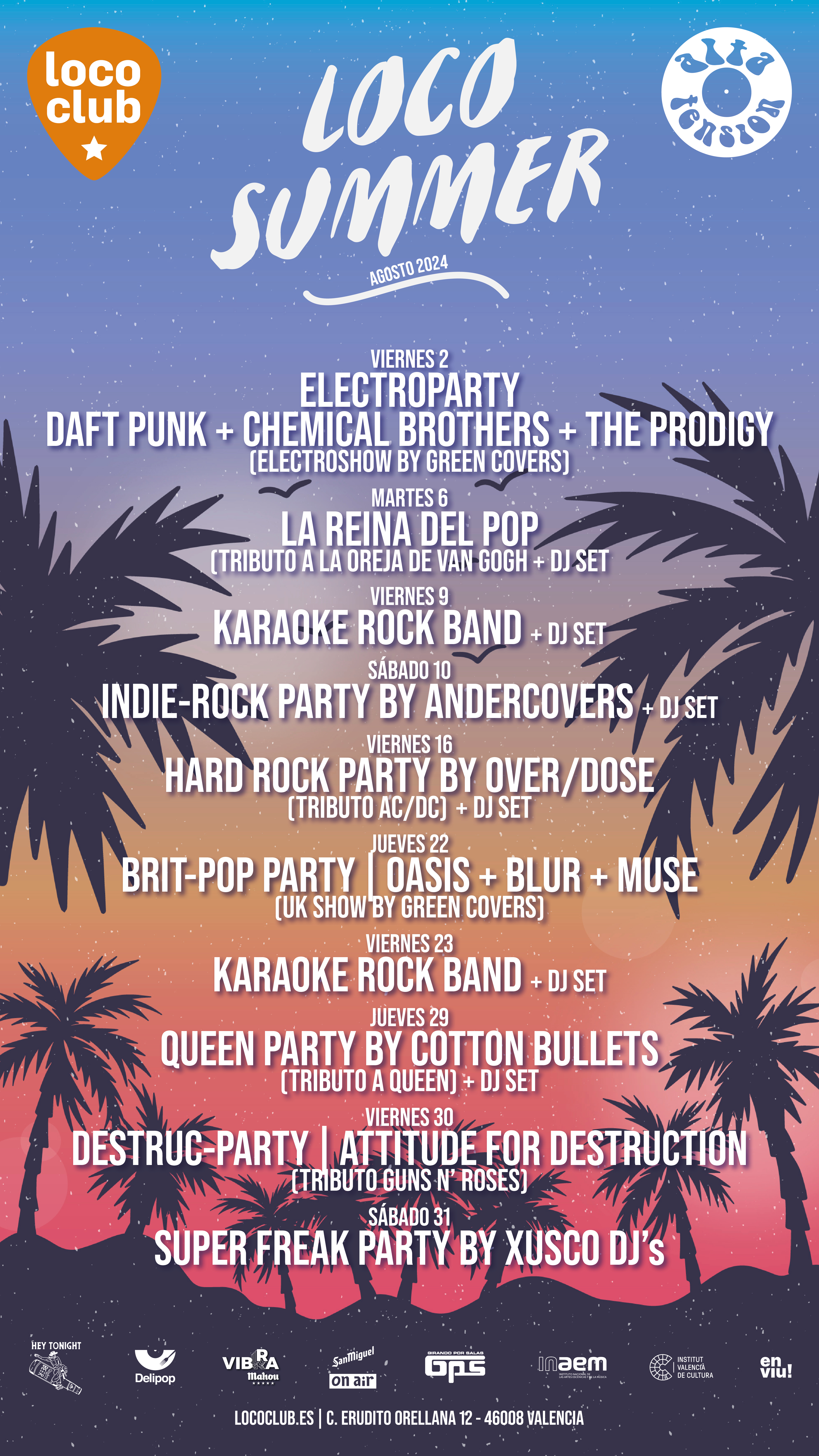 Loco Club ha preparado una programación especial para el mes de agosto: Loco Summer, vertebrada en fiestas con música en directo y dj set: bandas tributo y bandas tributo y bandas de versiones (a Daft Punk, The Chemical Brothers, The Prodigy, AC/DC, La Oreja de van Gogh, Oasis, Blur, Muse, Queen, Guns N’ Roses, entre otros) y karaoke con banda. Propuestas musicales distintas a su programación habitual, pero con el mismo buen ambiente de siempre.