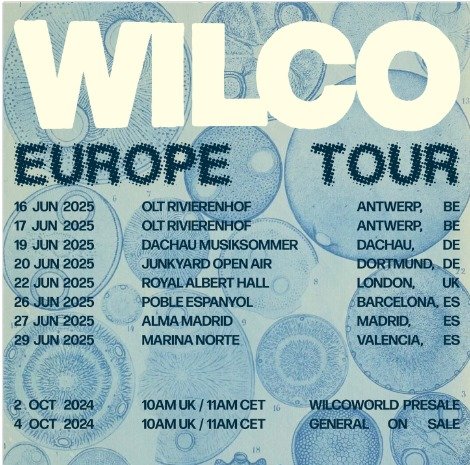 Wilco anuncian fechas en España el próximo año. La banda liderada por Jeeff Tweedy actuará el día 26 de junio de 2025 en Poble Espanyol de Barcelona, y el día 27 en el Auditorio del Parque Tierno Galván de Madrid. Ambas citas se encuadran en la programación del Alma Festival 2025.