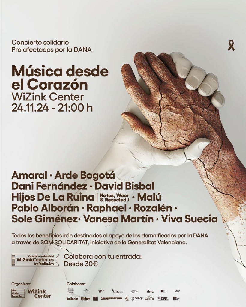 La música española se unirá el 24 de noviembre en el WiZink Center de Madrid en un concierto solidario, “Música desde el corazón”, con el objetivo de mostrar un sonoro afecto a los damnificados por la DANA y recaudar fondos que se sumen a las ayudas destinadas a reconstruir sus hogares y recuperar la normalidad después de la mayor catástrofe natural sufrida en nuestro país en este siglo.