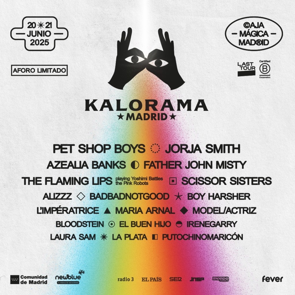 Encabezando el cartel, Pet Shop Boys llevarán su innovadora fusión de pop y teatralidad a KALORAMA Madrid. Con una carrera que abarca décadas, 15 álbumes de estudio y 44 sencillos en el Top 30 del Reino Unido, Neil Tennant y Chris Lowe continúan marcando el estándar en los espectáculos en vivo. Como parte de su gira Dreamworld: The Greatest Hits Live, que ya va por su cuarto año, ofrecerán un espectáculo electrizante que reafirma su estatus. La línea alta del cartel también estará presidida por la magnética voz de Jorja Smith, que desplegará su inconfundible fusión de R&B, soul y electrónica, consolidándose como una de las artistas más destacadas de su generación. Azealia Banks, siempre provocadora y vanguardista, subirá al escenario con su arrolladora presencia y su explosiva fusión de hip-hop, house y electrónica. El carisma escénico de Father John Misty dará vida a su particular visión del folk-rock contemporáneo, añadiendo su habitual mezcla de ironía y lirismo a esta edición. Tras 11 años sin pisar la península, Scissor Sisters regresan con su inconfundible fusión de glam, pop y actitud festiva. The Flaming Lips celebrarán en KALORAMA Madrid el 20 aniversario de Yoshimi Battles the Pink Robots, el álbum que los consolidó como una de las bandas más innovadoras del indie-psicodélico; un viaje sonoro entre lo humano y lo artificial, cargado de emoción, y fantasía.