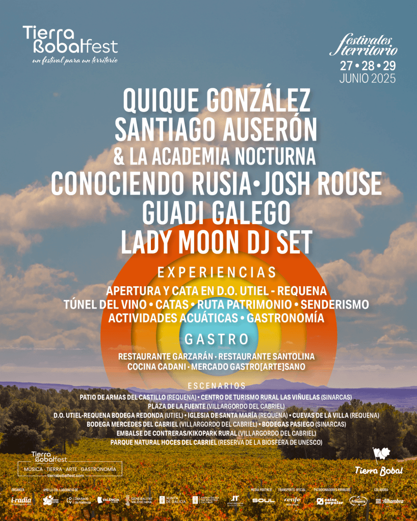 Tierra Bobal Fest presenta una programación que combina música en directo, patrimonio, vino y naturaleza. Con conciertos que se repartirán por diferentes escenarios o bodegas locales, el público podrá disfrutar en enclaves especiales de artistas como Quique González, un referente del rock español de autor; Santiago Auserón & La Academia Nocturna, conocido por formar parte de uno de los grupos más destacados de la Movida Madrileña, Radio Futura; desde Argentina llegará Conociendo Rusia, una de las bandas con más proyección internacional de latinoamérica y Premio Grammy Latino a la Mejor Canción Pop/Rock por “Cinco horas menos”. Completa el cartel el estadounidense Josh Rouse y desde Galicia una de sus artistas más destacadas, Guadi Galego, que con un estilo personal fusiona pop y folk tradicional. La dj Lady Moon estará también en esta nueva edición de Tierra Bobal Fest. Una propuesta musical que mezcla artistas de diferentes territorios con una marcada identidad propia.