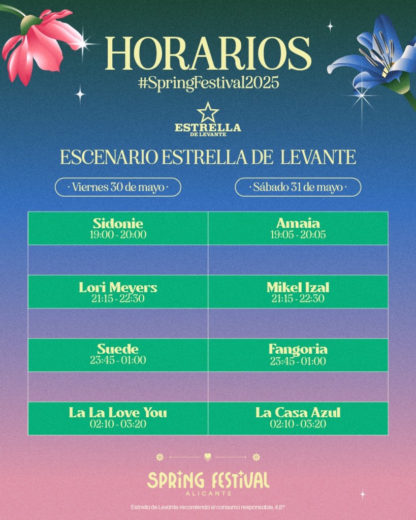 El esperado Spring Festival 2025 ya tiene horarios confirmados. La gran cita musical de la primavera en la provincia de Alicante se celebrará el viernes 30 y el sábado 31 de mayo en el recinto de Rabasa, con dos escenarios activos —Estrella de Levante, y ELPOZO King Up— que acogerán 18 actuaciones en directo de artistas nacionales e internacionales.
