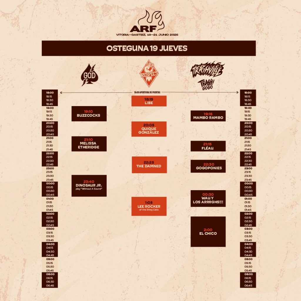 El Azkena Rock Festival arranca con fuerza con Dinosaur Jr., que interpretarán íntegramente su mítico álbum de 1994, Without a Sound, en un único concierto en nuestras fronteras donde también sonarán otros clásicos de su repertorio. The Damned, pioneros del punk británico, también en fecha exclusiva, con una de sus formaciones más clásicas. Les sigue la inconfundible voz de Melissa Etheridge, un icono del rock americano desde su debut a finales de los 80. Los estribillos pegajosos de punk melódico de los Buzzcocks, el rock de autor de Quique González, la intensidad de Libe y el mítico Lee Rocker, de los Stray Cats, que se suma al cartel tras la baja de Masters of Reality. En Trashville, la locura garajera de Wau y los Arrrghs!!!, el hardcore medieval de Fléau, la explosiva fiesta italiana de Gogoponies y el ritmo latino de los trogloditas Mambo Rambo calentarán la carpa. El DJ El Chico cerrará la noche con una sesión vibrante.