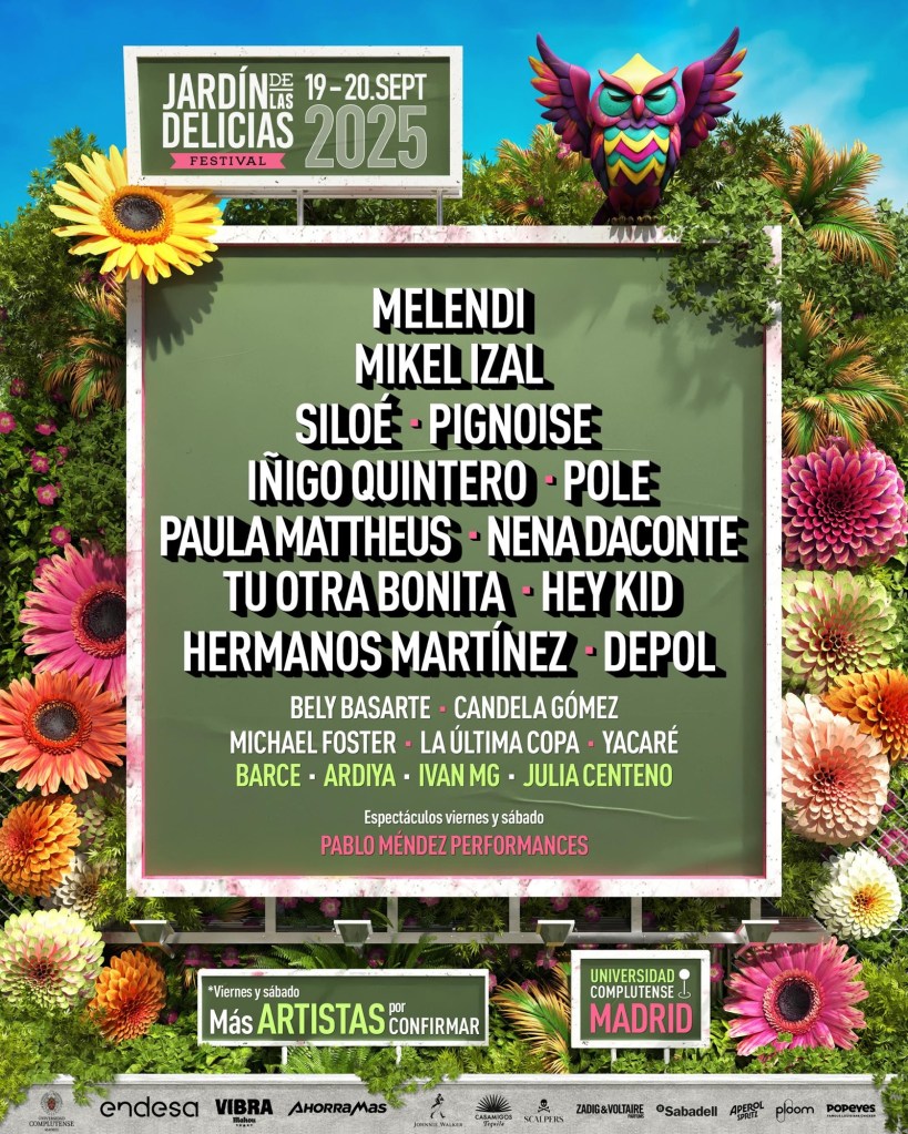 El festival Jardín de las Delicias anuncia nuevos artistas para su sexta edición: Mikel Izal, Siloé, Paula Mattheus, Tu Otra Bonita, Hermanos Martínez, Bely Basarte, Candela Gómez, Michael Foster, La Última Copa y Yacaré se suman a esta gran celebración de la música en castellano que tendrá lugar los días 19 y 20 de septiembre de 2025.