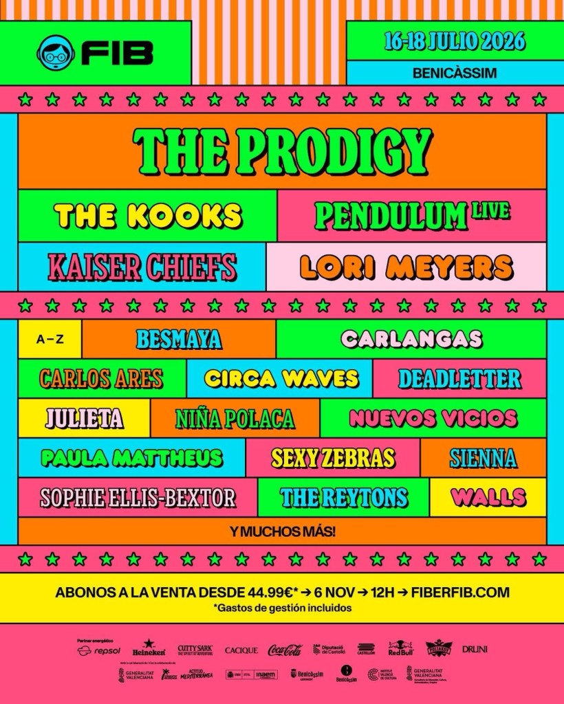 Primer avance de cartel del Festival Internacional de Benicàssim. Si el pasado lunes la organización del festival castellonense empezó fuerte con las confirmaciones de Pendulum, Kaiser Chiefs y Lori Meyers, hoy martes han anunciado a nuestros queridísimos The Prodigy, como primer cabeza de cartel. Junto a ellos se suman también al line up de la edición de 2026; The Kooks, Besmaya, Carlangas, Carlos Ares, Circa Waves, Deadletter, Julieta, Niña Polaca, Nuevos Vicios, Paula Mattheus, Sexy Zebras, Sienna, Sophie Ellis-Bextor, The Reytons y Walls.